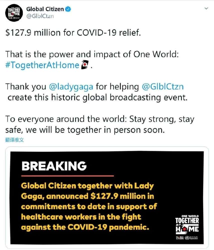 “同一世界:团结在家”演唱会结束后,据Global Citizen官方数据,活动共筹集到1.279亿美元善款,这笔善款将会用来帮助全世界的医护人员对抗疫情。