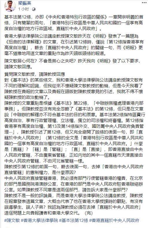 【香港商报网讯】针对港大法學院公法講座教授陳文敏昨日在《明報》的刊文内容,全国政协副主席梁振英今日在Facebook发文駁斥陳文敏政治動機不純。