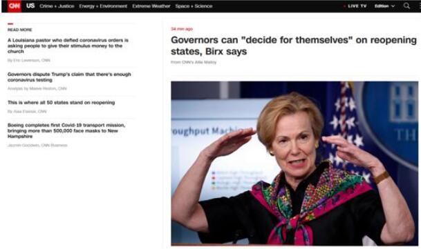 【香港商报网讯】防疫形势下重启经济已成为美国社会关注的焦点之一。“伯克斯说,州长们可‘自行决定’重新开放各州。”美国有线电视新闻网(CNN)20日报道称,白宫冠状病毒应对工作组协调员德博拉?伯克斯在白宫当天举行的新冠肺炎疫情发布会上表示,虽然各州长需遵循有关各州重新开放经济的联邦指导意见,但各州长均可“自行决定”(是否重启经济)。