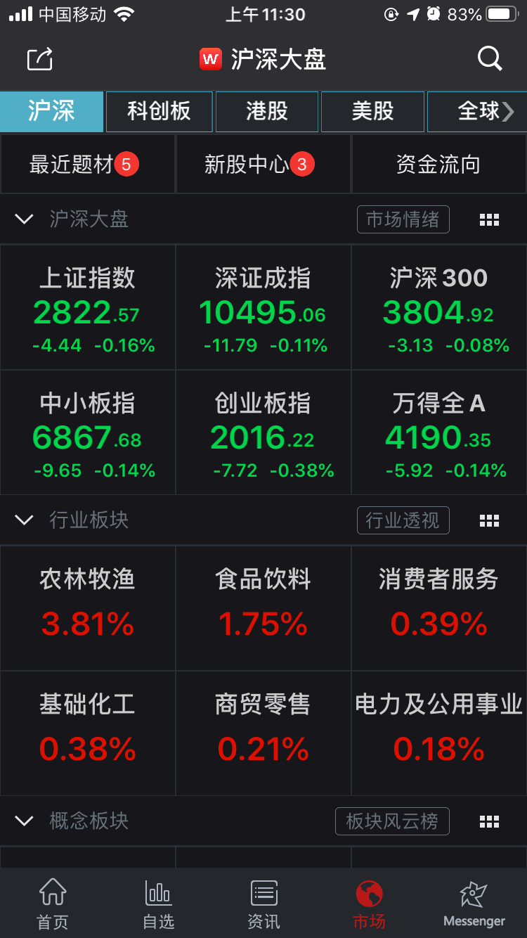 【香港商报网讯】两市低开高走,三大股指一度全线翻红。随后,两市震荡走低,三大股指悉数翻绿。截至午盘收盘,沪指跌0.16%,深成指跌0.11%,创业板指跌0.38%。