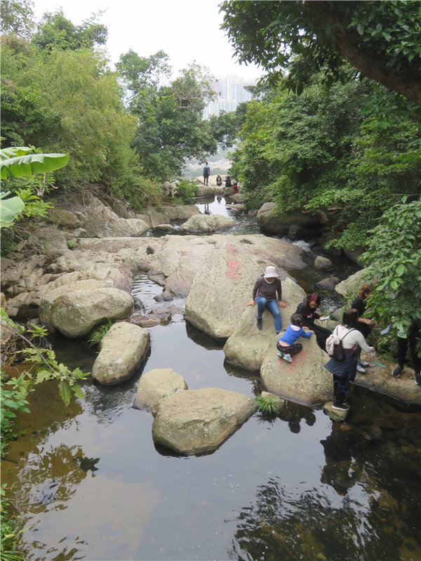 遊人在徑上石澗玩樂,遠處隱約看到將軍澳樓群。
