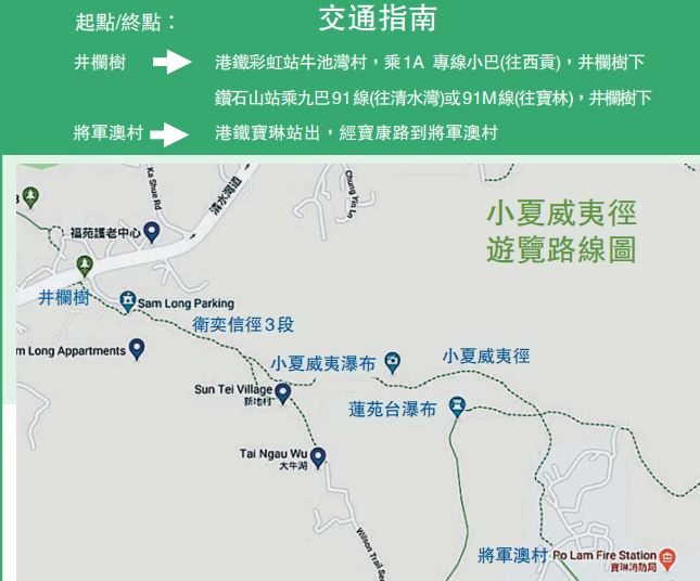 從地理上看,由將軍澳村起步,經小夏威夷徑、衛奕信徑到井欄樹,基本上是緩緩上坡路,因此若改為由井欄樹作起點,走緩緩下坡路,會感到舒適些。