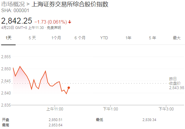 上證指數半日收報2842點,跌1點或0.06%,早段最多跌4點或0.16%,低見2839點;最多升9點或0.34%,高見2853點,成交1617.88億元(人民幣‧下同)。