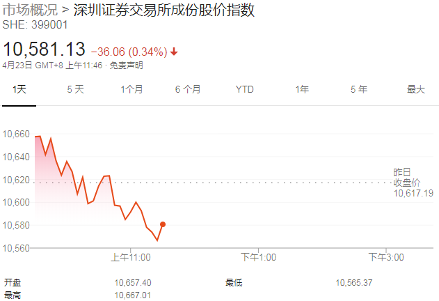 深成指收報10581點,跌36點或0.34%,低見10565點,跌51點或0.49%;高見10667點,升49點或0.47%,成交2514.04億元。