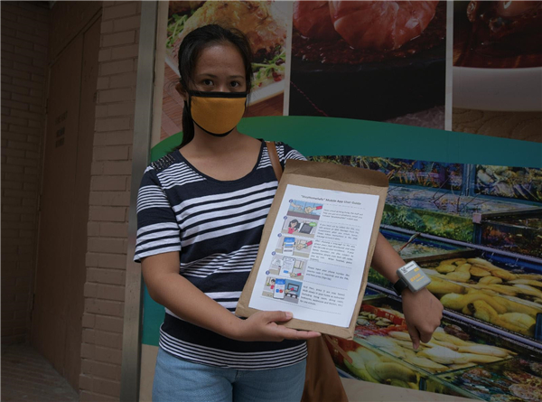 一名外傭展示衛生署派監察手帶發的家居指引及左腕上的。