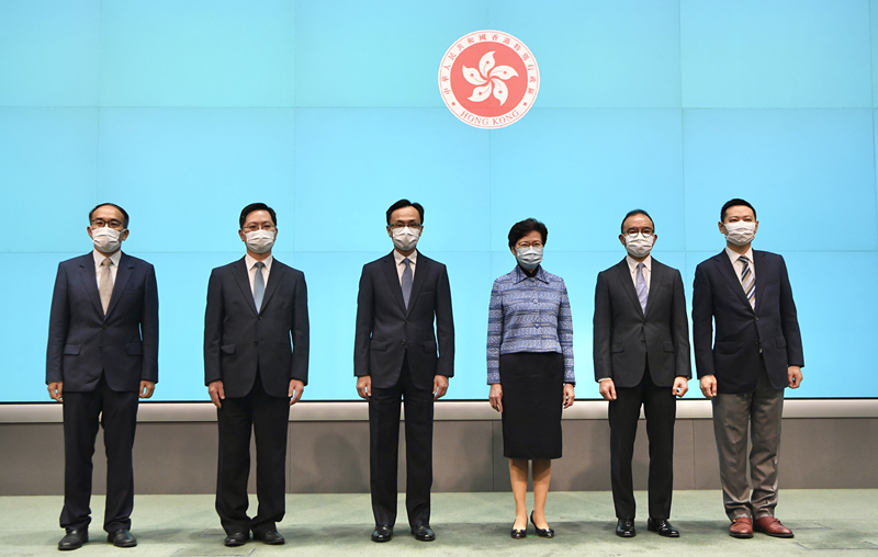 昨日,林鄭月娥(右三)率5位新任命官員會見傳媒。 中通社