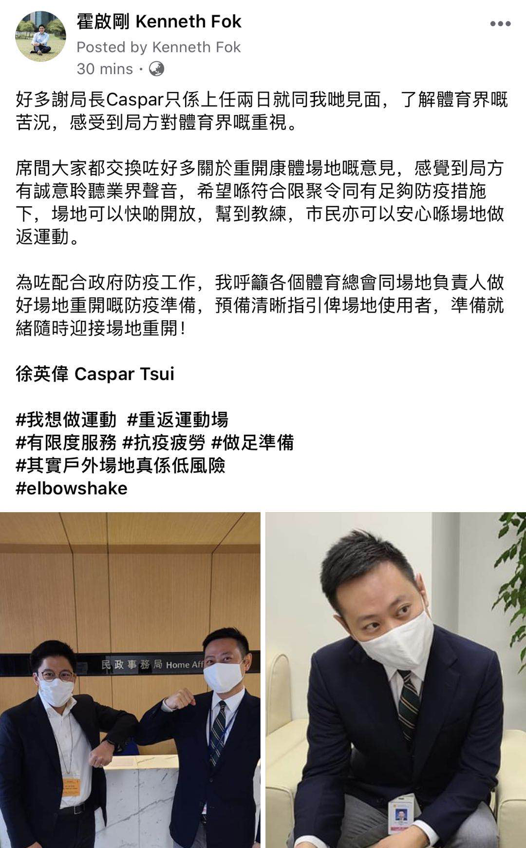 霍啟剛在其facebook帖文表示,很感激徐英偉上任兩日便與體育界見面,了解體育界所面對的苦況,感受到局方對體育界的重視。