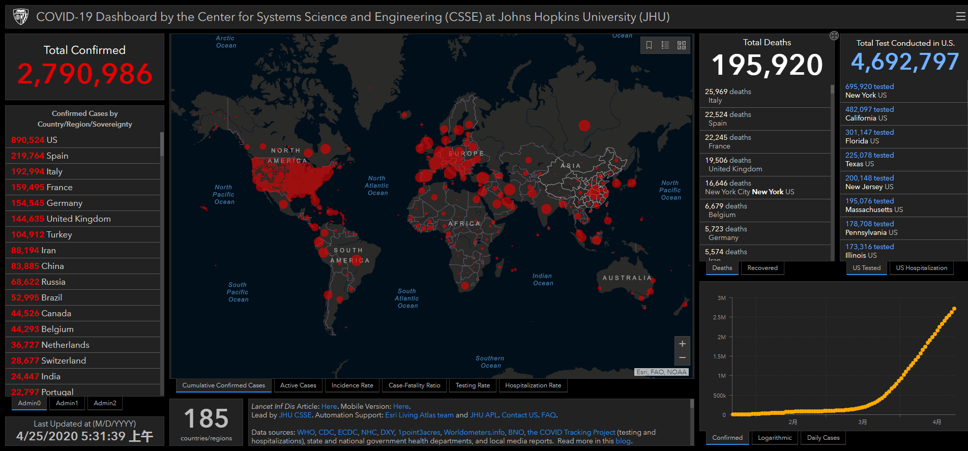 【香港商報網訊】根據美國約翰斯・霍普金斯大學的統計,截至香港時間4月25日上午5:31,全球有逾279萬人確診感染新型肺炎,近19.6萬人死亡。其中,美國成為全球最多確診及死亡個案的國家,累計確診超89萬人,死亡人數超5萬。