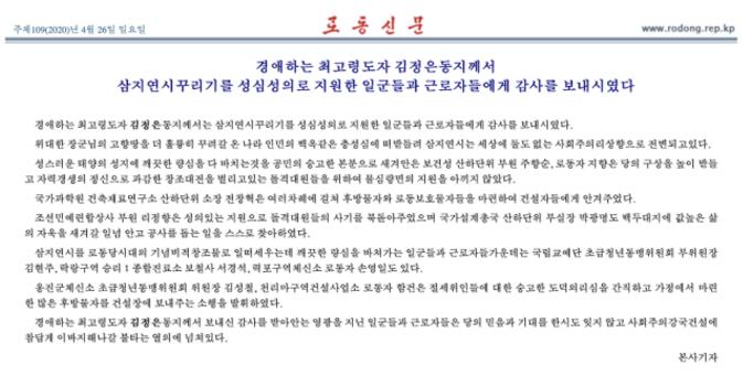 【香港商报网讯】据朝鲜劳动党机关报《劳动新闻》26日报道,朝鲜最高领导人金正恩向支援三池渊建设的工作人员表示感谢。收到来自金正恩的谢意,当地工作人员感到无比光荣,表示将以更高的热情投入建设工作。
