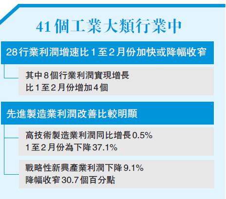 數據顯示,多數行業利潤有所改善,3月份,41個工業大類行業中,28個行業利潤增速比1至2月份加快或降幅收窄,其中8個行業利潤實現增長,比1至2月份增加4個。