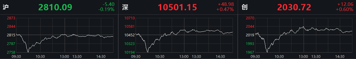 【香港商报网讯】两市高开后迅速跳水,三大股指早盘一度跌逾2%。随后,两市走出V型反弹,三大股指全线翻红,创业板指涨近1.3%。午后,A股震荡回落,沪指翻绿。截至收盘,沪指跌0.19%,深成指涨0.47%,创业板指涨0.60%。