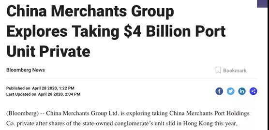 28日下午,彭博社报道,据知情人士透露,招商局集团正在考虑将招商局港口控股有限公司私有化。彭博社称,因事属机密而不愿意透露姓名的知情人士说,招商局集团已买下招商局港口所有剩余股份的可行性与顾问公司进行了初步磋商。