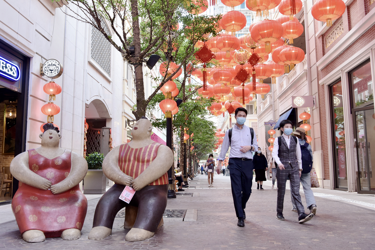 卫生防护中心提醒市民,疫情虽稍为缓和,市民仍应尽量避免聚餐或聚会等社交活动。图为湾仔囍帖街一景,人流因疫情放缓增加。中通社