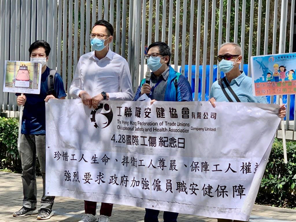 工聯職安健協會趁國際工傷紀念日,於副主席葉偉明、委員張樞宏、香港建造業總工會權益及投訴主任吳偉樑及立法會議員陸頌雄帶領下到政府總部請願。該會呼籲僱主要切實履行保障僱員職安健之責任,提供更安全的工作設施及環境,而政府更是責無旁貸,必定要加強監管職安健的發展。