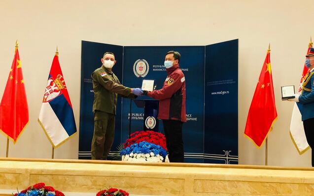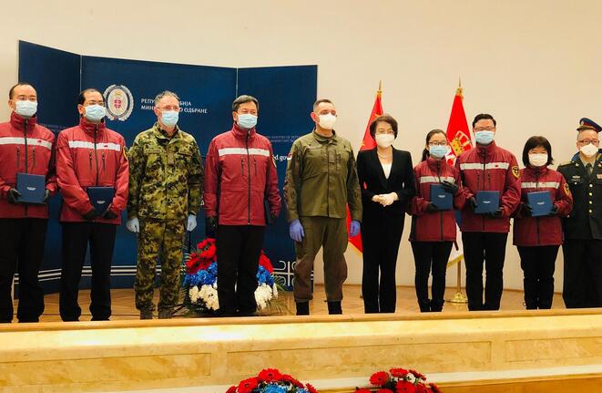国防部长武林在讲话中指出,在困难甚至是死亡面前,中国和塞尔维亚表现出了英雄民族的气概!而在抗击病毒的难熬时期,塞尔维亚并不孤独,感谢中国政府给予的及时回应,中国专家组在塞尔维亚最困难时期抵达,这一点,塞尔维亚永远不会忘记。