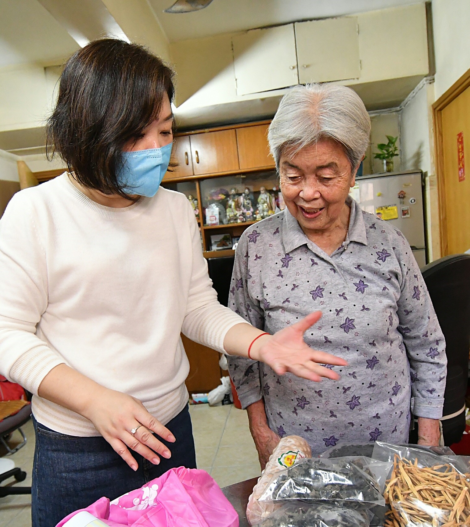 鍾姑娘(左)為茹素(右)的芳姐送上素食食材。