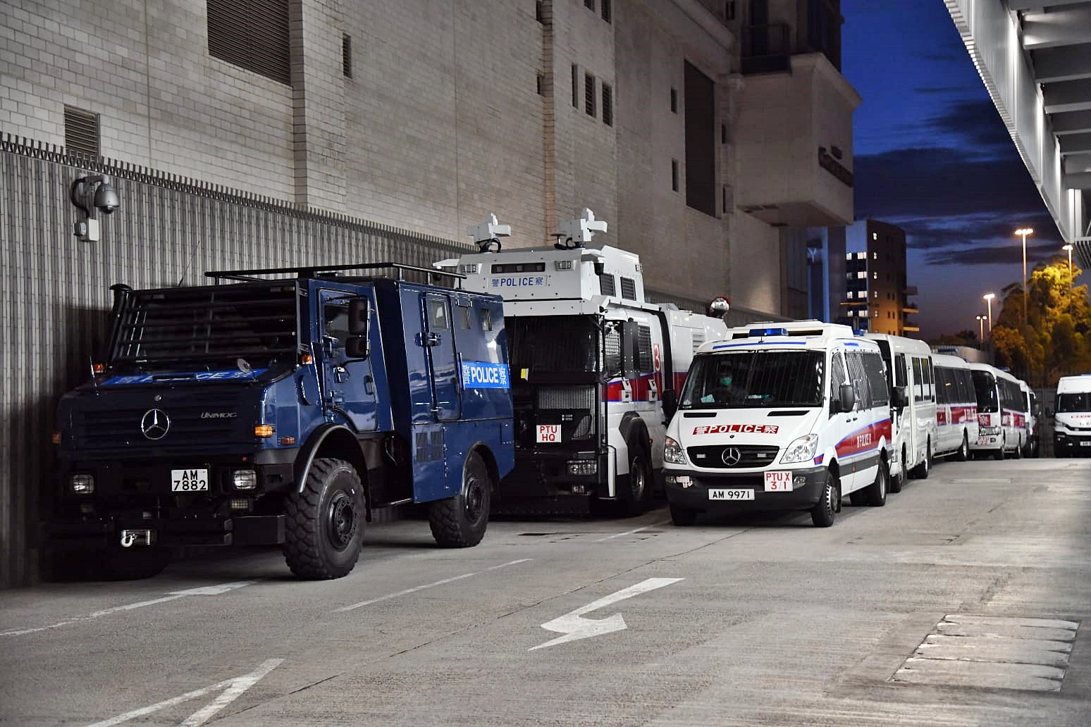 銳武裝甲車及水炮車已停泊於油麻地警署內,另有多輛衝鋒車。圖:星島