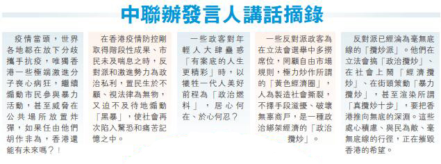 發言人表示,有民調顯示,七成以上的香港市民反對「攬炒」,更有超過八成的市民對未來「表示焦慮」,擔心疫情平復後「黑暴」再起,驚魂未定可見一斑。恢復秩序、重回正軌是香港社會主流民意,我們堅定支持香港特區政府和警隊依法嚴懲暴力犯罪分子,採取有效措施維護香港法治秩序和公眾安全,維護國家安全。我們呼籲所有關愛香港、以香港為家的人們,勇敢地團結起來,堅決與暴力割席,向「攬炒」說不,決不允許幾代港人打拼造就的繁榮毀於一旦。