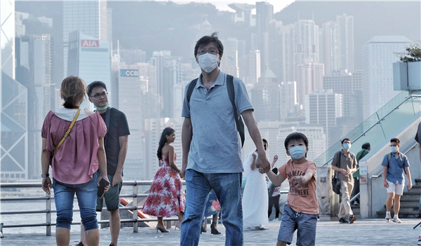 港府擬向全民派發可重用口罩以加強防疫。圖為疫情趨緩和,市民到尖沙咀海旁散心。中通社