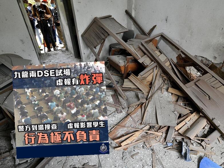 警方表示,早前有網民呼籲他人在香港中學文憑考試期間非法堵路,以達致「攬炒」目的,雖然上述情況未見發生,不過在今日上午,警方接到匿名報案指分別在九龍區兩個試場有炸彈。警方及後進入學校進行搜索,最後證實虛報。案件列作「炸彈嚇詐」處理,現交由刑事調查隊跟進。