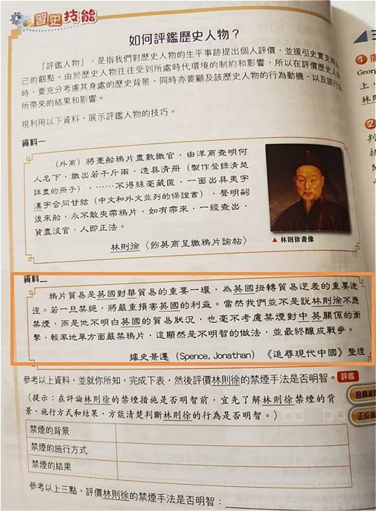 引发争议的课本数据内容如下:「鸦片贸易是英国对华贸易的重要一环,为英国扭转贸易逆差的重要途径。若一旦禁绝,将严重损害英国的利益。当然我们并不是说林则徐不应禁烟,而是他不明白英国的贸易状况,也毫不考虑禁烟对中英关系的冲击,轻率地单方面严禁鸦片,这显然是不明智的做法,并最终酿成战争。」