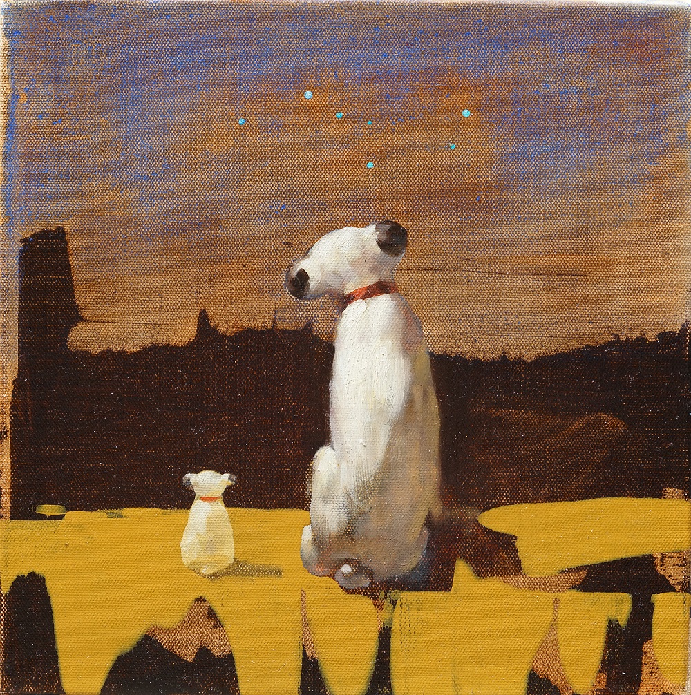廖井梅作品《Nipper的暇想》。除了寫人體和風景,廖氏還有充滿童趣的作品。該作品以小狗為「主角」,寫實地描繪小狗的蹲姿,背景則由不同色塊組成,虛實相融。