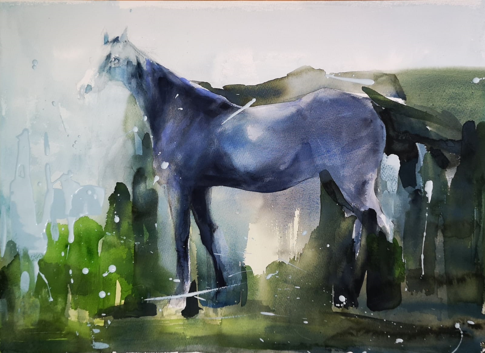 廖井梅1997年移居香港,並繼續開班授徒,將自己所學傾囊相授。「繪畫展現了藝術家所看見的事物,如何看出與他人不同的觀點,是我教導學生的重點。」她強調自己會教學生觀看的方法,每個人的作品都應有其特色,「像我繪畫就是尋找自己、了解自己的過程,所以我不會用美來形容自己的作品。」廖氏坦言,自己的作品充滿矛盾與衝突。《踏青》和《昂藏》中的馬均靜立不動,與恍如雲霧流動般的背景形成對比,一剛一柔,引人深思。