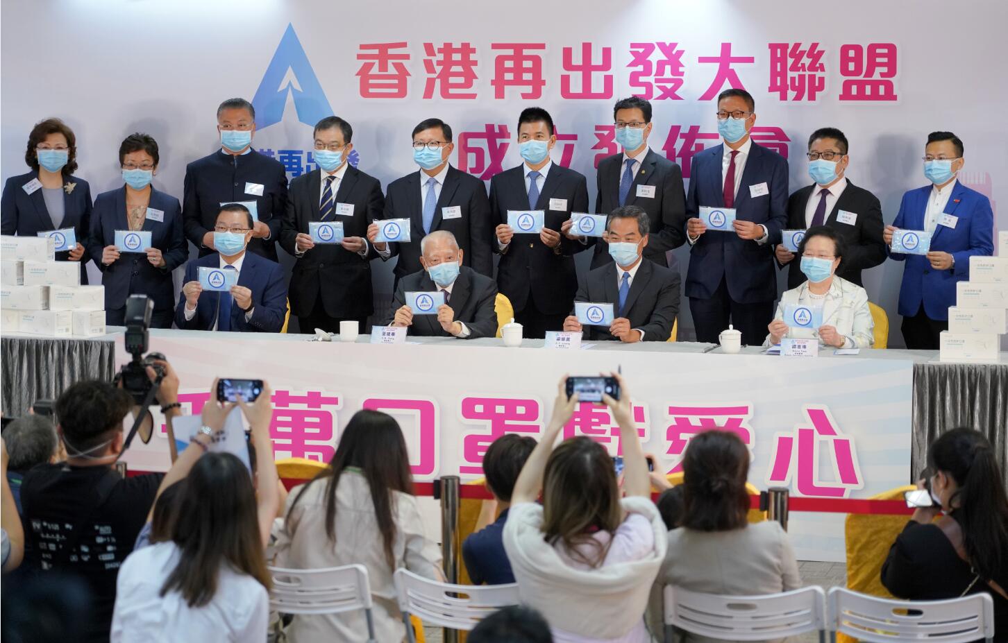 【香港商報网訊】記者林駿強報道:由全國政協副主席董建華及梁振英擔任總召集人、全國人大常委譚耀宗任秘書長、基本法委員會副主任譚惠珠等11位人士任副秘書長、全港1545位各界人士擔任共同發起人的「香港再出發大聯盟」,昨宣布正式成立。大聯盟發布《共同宣言》明言:要堅守「一國兩制」,香港要再出發;要積極重振經濟,民生要再出發;要重歸法治,穩定要再出發;必須團結,繁榮要再出發。大聯盟成立後第一個大活動是5月9日、10日,在全港18區派發1000萬個口罩。