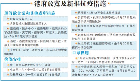 規管飲食業和其他業務及處所措施,以及限聚令原定在5月7日午夜到期,林鄭月娥宣布,兩條規例將延長至5月21日,政府同時會放寬部分管制措施,包括餐飲處所的同枱人數上限會放寬至8人,其他的規定則維持不變。其次,7類處所可以重新營業,包括遊戲機中心、健身中心、遊樂場所、包括戲院在內的公眾娛樂場所、美容院、按摩院,以及麻雀天九耍樂處所,上述處所在營業期間須遵守規定,例如佩戴口罩、進入時須量體溫、提供搓手液等,部分行業須遵守特定規定,例如戲院不可以坐滿、美容師做療程時須採取額外保護措施。