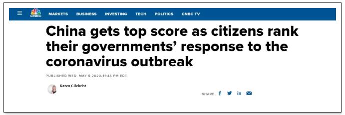 CNBC说,不仅如此,还有一项数据中国明显高于西方,那就是85%的中国受访者认为,经历过疫情之后自己的国家会变得“更强”,而有同样想法的美国人只有41%。