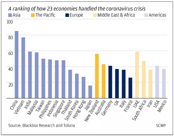 【香港商报网讯】“中国85分,美国41分”,本周三,一家新加坡民调机构公布针对全球23个经济体抗疫表现所做的民调结果,给出了这样分数。不仅如此,这一榜单上,亚洲国家受访者对政府的评价明显高于西方国家,得到56分的新西兰成了西方世界中唯一得分超过平均分(45分)的独苗,美英法德意以及澳大利亚的分数都在全球平均分以下。