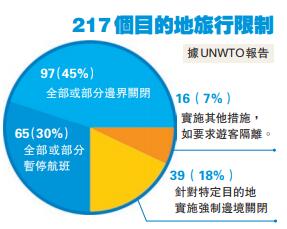 報告指出,限制分為四大類。在217個目的地中,97個國家和地區(或45%)實施了全部或部分邊界關閉;65個國家和地區(或30%)全部或部分暫停航班;39個國家和地區(或18%)針對特定目的地實施強制邊境關閉;16個國家和地區(佔其餘7%)實施了其他措施,例如要求遊客隔離。UNWTO表示,截至4月20日,這些國家和地區均未解除任何禁止、限制或阻止遊客(在某些情況下還包括居民)進入邊界的措施。