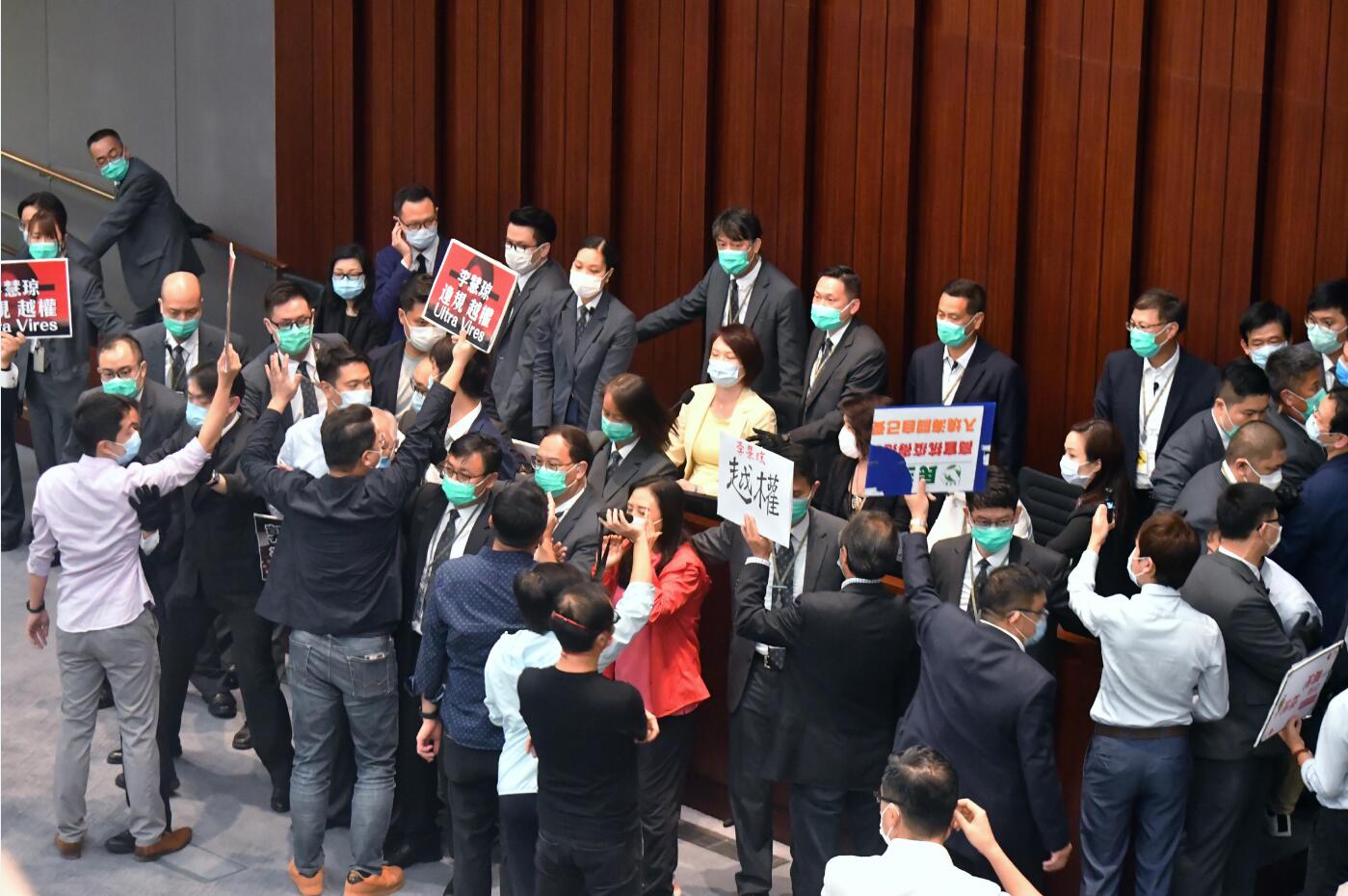 主持內會會議中,李慧琼被 反對派議員包圍,保安人員被 迫組成人牆阻擋。 記者 馮瀚文攝