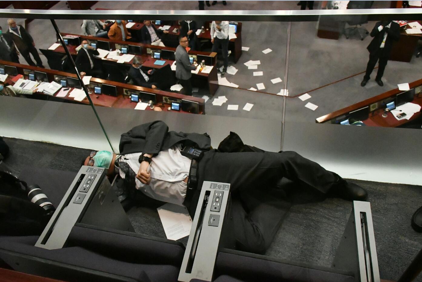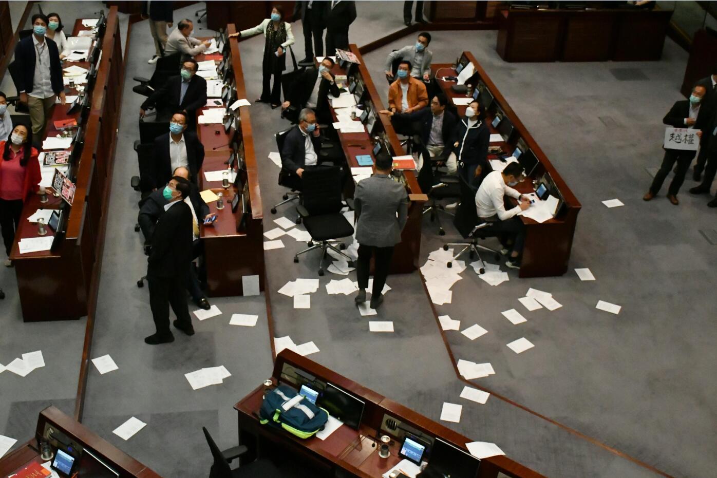 昨日會議室一的混亂情況,始於下午1時多。那時立法會教育事務委員會會議已完結,作為內委會現任主席的民建聯主席李慧琼,以及試圖「主持」下午會議的郭榮鏗,均步向主席台。李慧琼成功坐到主席台,多位反對派議員隨即起哄,試圖衝向主席台;民建聯、工聯會等建制派議員,以及立法會的保安員,則圍住李慧琼,對她給予保護。