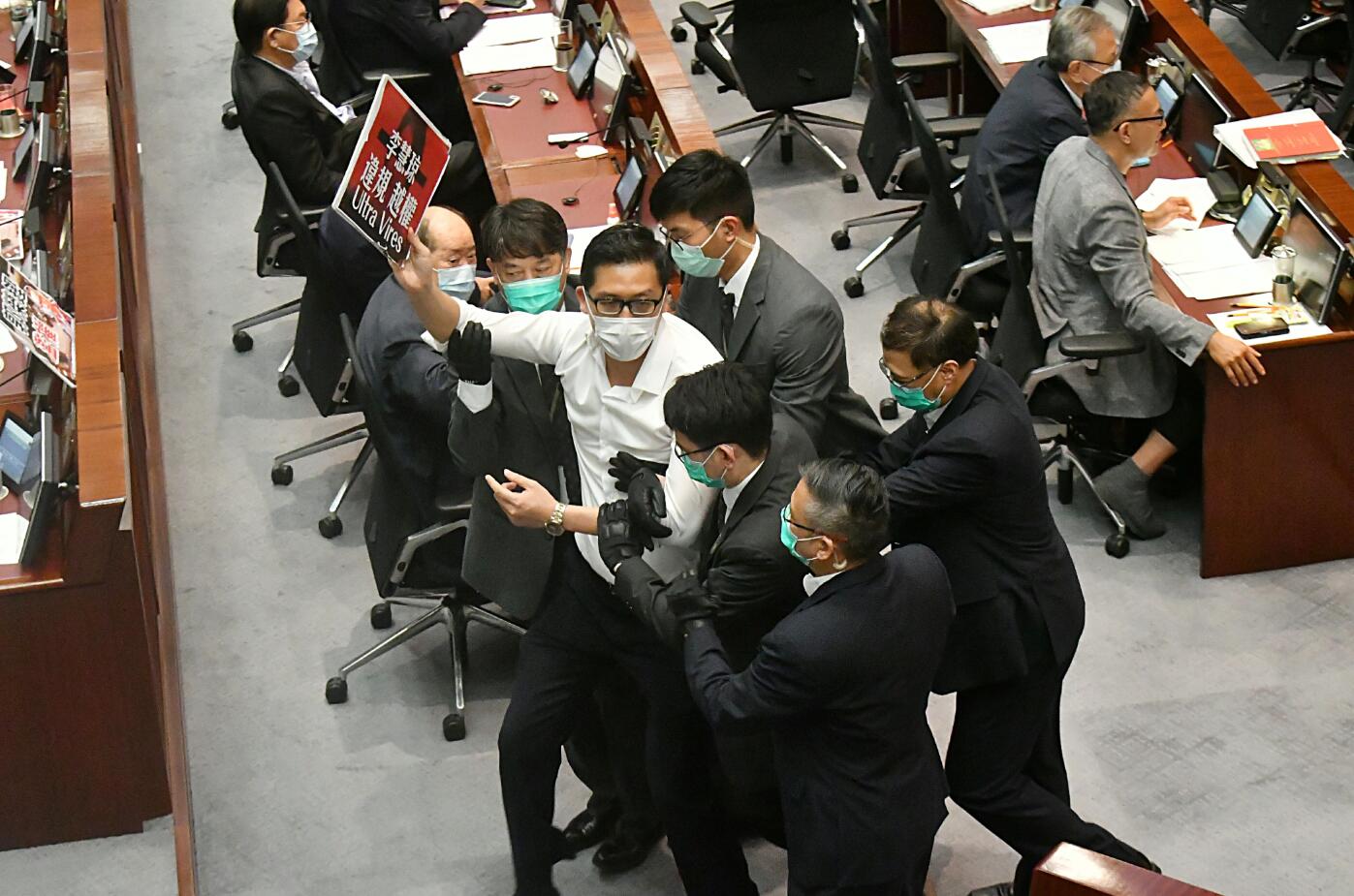 反對派議員被趕離會議室。 記者 馮瀚文攝