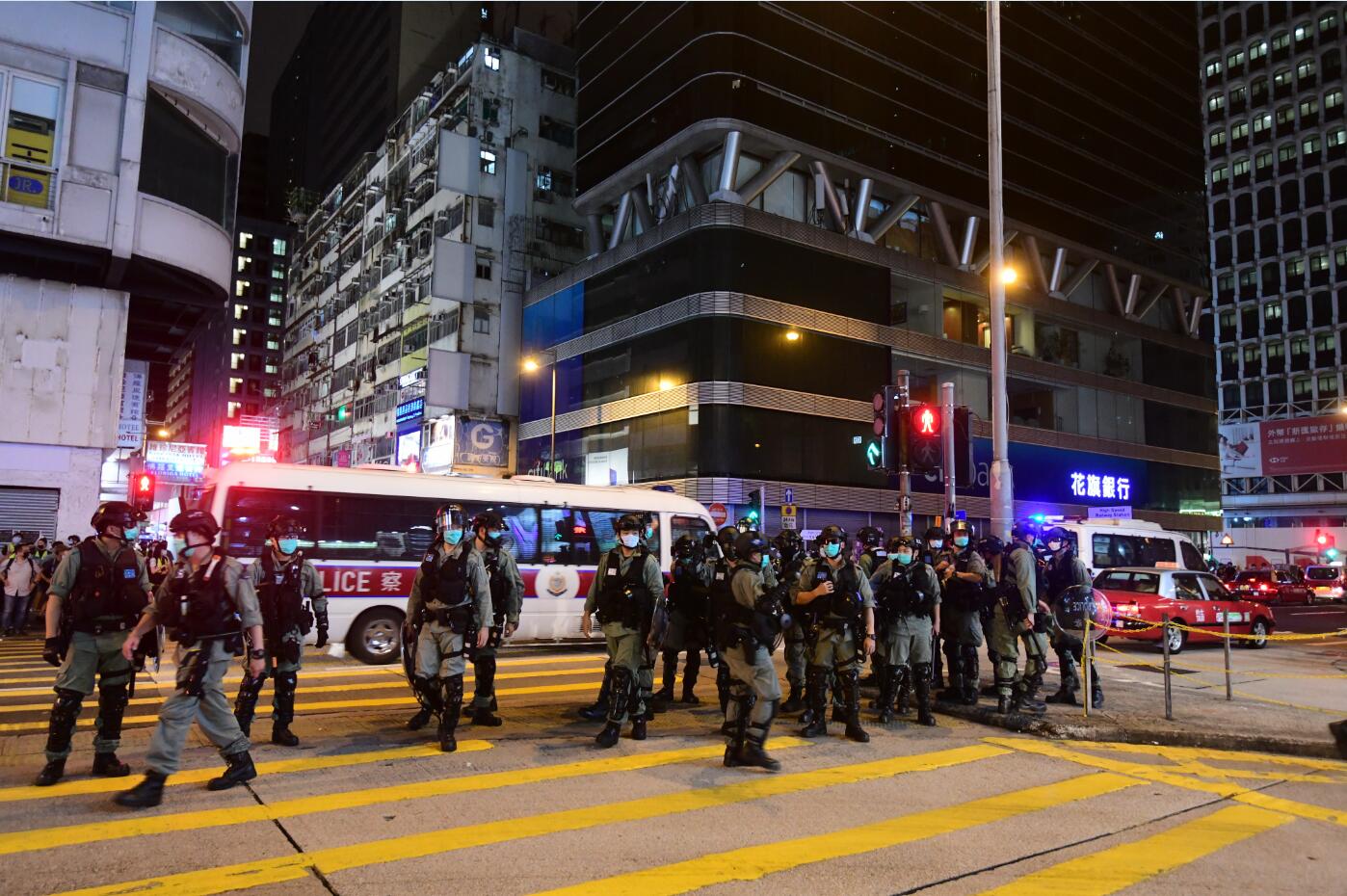 旺角堵路後有防暴警戒備。 記者 崔俊良攝