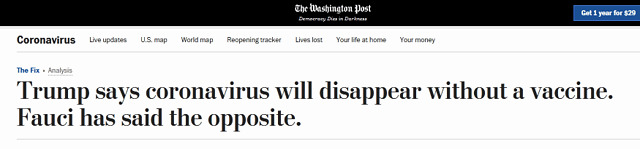 《华盛顿邮报》报道截图:特朗普称新冠病毒将在没有疫苗的情况下消失,福奇的说法正好相反