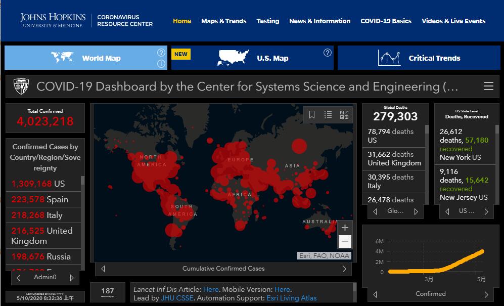 据美国约翰斯·霍普金斯大学实时统计数据显示,截至香港时间5月10日9时32分,全球新冠病毒感染病例近4023539例,死亡逾279307例。其中,美国确诊超1309159万,死亡78792例。总统特朗普女儿私人助理新冠病毒检测呈阳性,首脑身侧多人中招 白宫防疫险象环生;美国纽约州不明疾病致3童死亡,或与新冠病毒相关;法国“解封”前夕出现新聚集性感染;德国“解封”后多地新增确诊病例突破“红线”;韩国娱乐场所引发集体感染,已致40人确诊;疫情加剧部分非洲国家粮食安全问题。