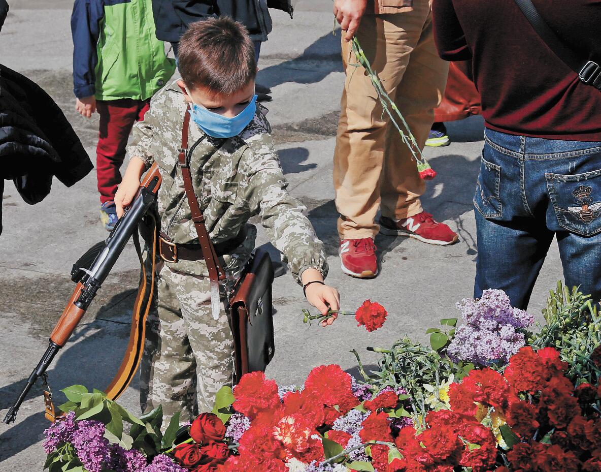 昨日,在烏克蘭,一個男孩在無名戰士墓上獻 花,紀念二戰勝利75周年。 路透社