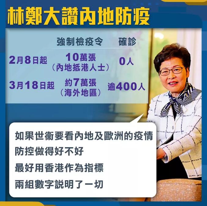 她指出,自2月8日至今,卫生署向内地抵港人士发出超过十万张强制检疫令,当中「零确诊」;而自3月18日起,卫生署向外国地区抵港人士发出约七万张强制检疫令,当中逾400人确诊,包括200多名英国返港留学生。「如果世卫要看中国内地及欧洲国家的疫情防控做得好不好,最好用香港作为指针,两组数字说明了一切。」