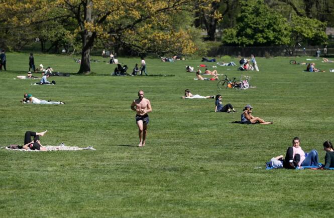 当地时间4月28日,新冠肺炎疫情下的纽约中央公园,躺满了晒日光浴的民众。中新社