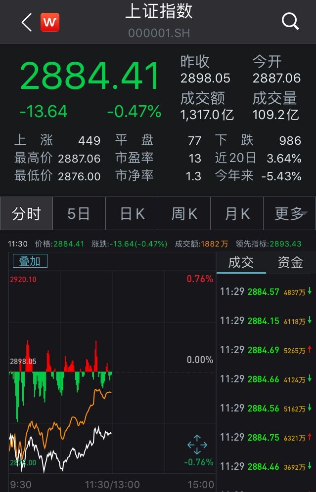 【香港商报网讯】A股今日集体低开,早盘三大指数维持低位运行。截至午间收盘,沪指报2884.41点,跌幅0.47%,成交量1316.99亿元;深成指报11045.73点,跌幅0.26%,成交量2156.12亿元;创业板指报2136.70点,跌幅0.19%。