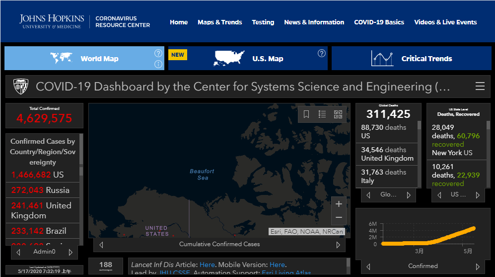 据美国约翰斯•霍普金斯大学最新发布的新冠疫情最新统计数据显示,全球累计确诊病例超过463万例。