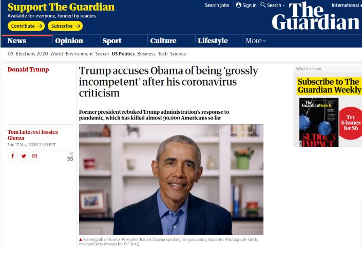 《卫报》:特朗普在受到奥巴马关于新冠病毒的批评后指责其“极其无能”