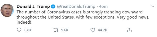 值得一提的是,特朗普还更新一则推特宣布一则“好消息”。他写道:“在美国,新冠病毒病例数量正在呈强烈下降趋势,只有很少数的例外。的确是个好消息!”