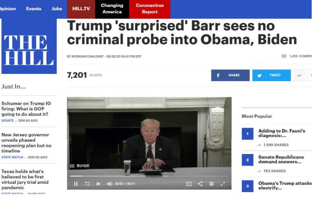 近日,美国总统特朗普与前总统奥巴马“杠”上后,特朗普直接要求参议院司法委员会主席格雷厄姆调查“奥巴马门”。而参议院随后也展开了一系列调查行动。但据环球网援引《国会山报》消息称,美国司法部长威廉·巴尔当地时间5月18日表示,他预计司法部不会就涉俄调查问题对前总统奥巴马和前副总统拜登展开刑事调查。对此,特朗普回应称,巴尔的决定令他感到“惊讶”。