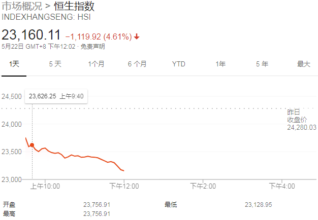 【香港商報網訊】恒指持續捱沽,臨近午市跌幅擴大至過千點,最新造23177,插1102點或4.54%,成交金額820億元。