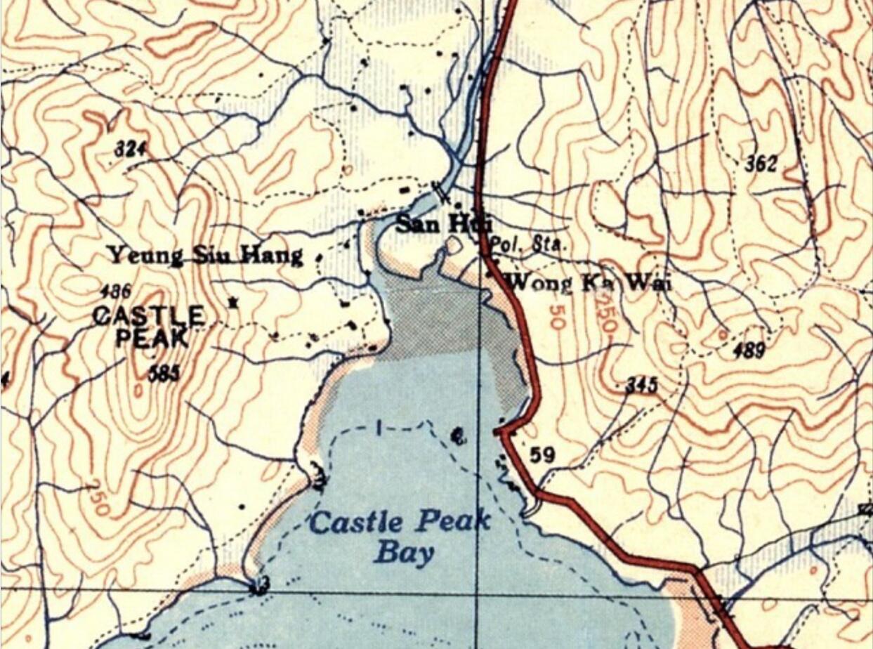 早期的青山地圖,顯示尚未填海的青山灣。地圖 上的紅色長線是青山公路,可見標示新墟(San Hui)旁的Pol.Sta.即第一代青山警署位置。
