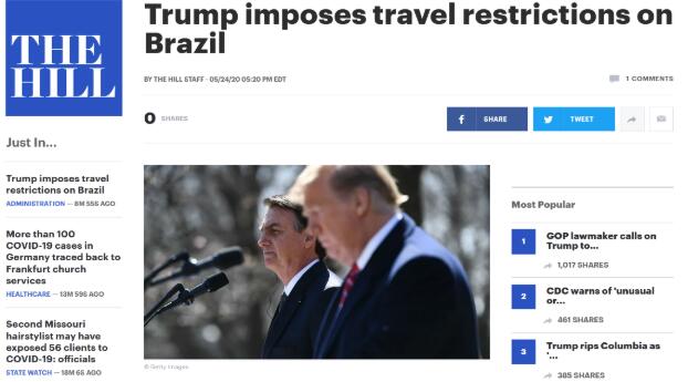 据环球网援引美国《国会山报》消息,白宫24日宣布,鉴于巴西新冠肺炎病例数不断激增,特朗普总统将限制来自巴西的非美国公民入境。