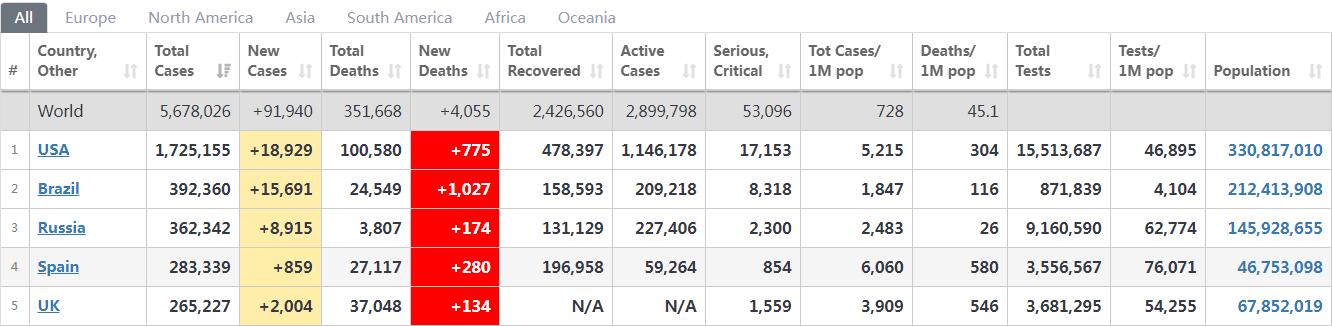 据统计网站worldometer,全球昨天已有超过550万人染疫,超过34万人不治;最严重的美国增至超过170万人确诊,10万人死亡。